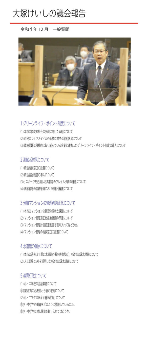 令和4年3月 代表質問 令和3年6月 一般質問 令和2年9月 一般質問 令和2年3月 一般質問 令和元年9月 一般質問 平成30年12月 一般質問 平成30年3月 一般質問 平成29年9月 一般質問 平成29年3月 一般質問 平成28年9月 代表質問 平成27年9月 一般質問 平成26年12月一般質問 平成26年3月 一般質問 平成25年9月 一般質問 平成24年6月 一般質問 平成23年6月 一般質問 平成22年6月 一般質問