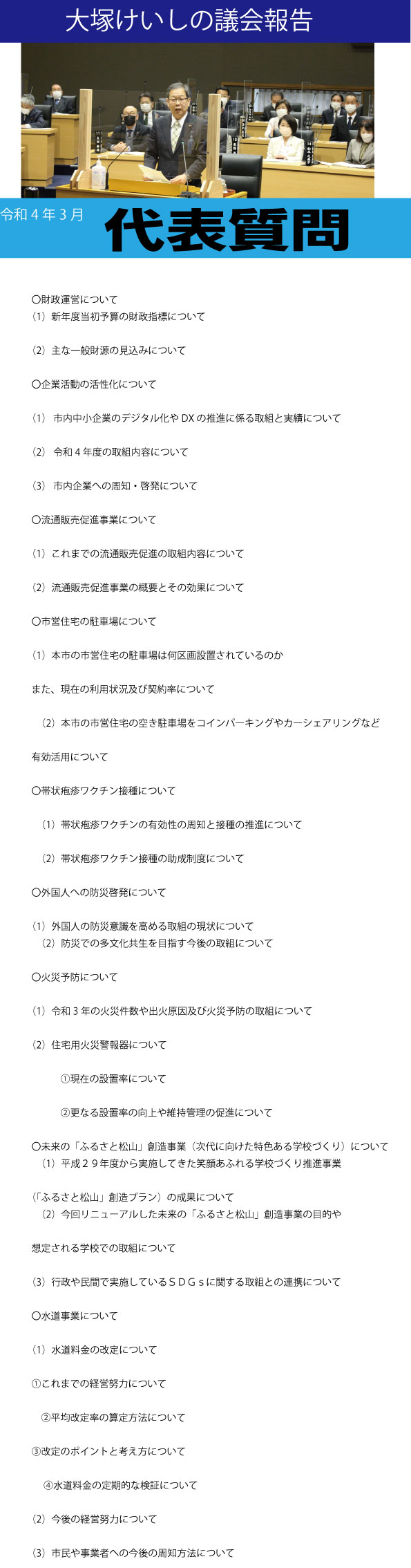 令和3年6月 一般質問 令和2年9月 一般質問 令和2年3月 一般質問 令和元年9月 一般質問 平成30年12月 一般質問 平成30年3月 一般質問 平成29年9月 一般質問 平成29年3月 一般質問 平成28年9月 代表質問 平成27年9月 一般質問 平成26年12月一般質問 平成26年3月 一般質問 平成25年9月 一般質問 平成24年6月 一般質問 平成23年6月 一般質問 平成22年6月 一般質問